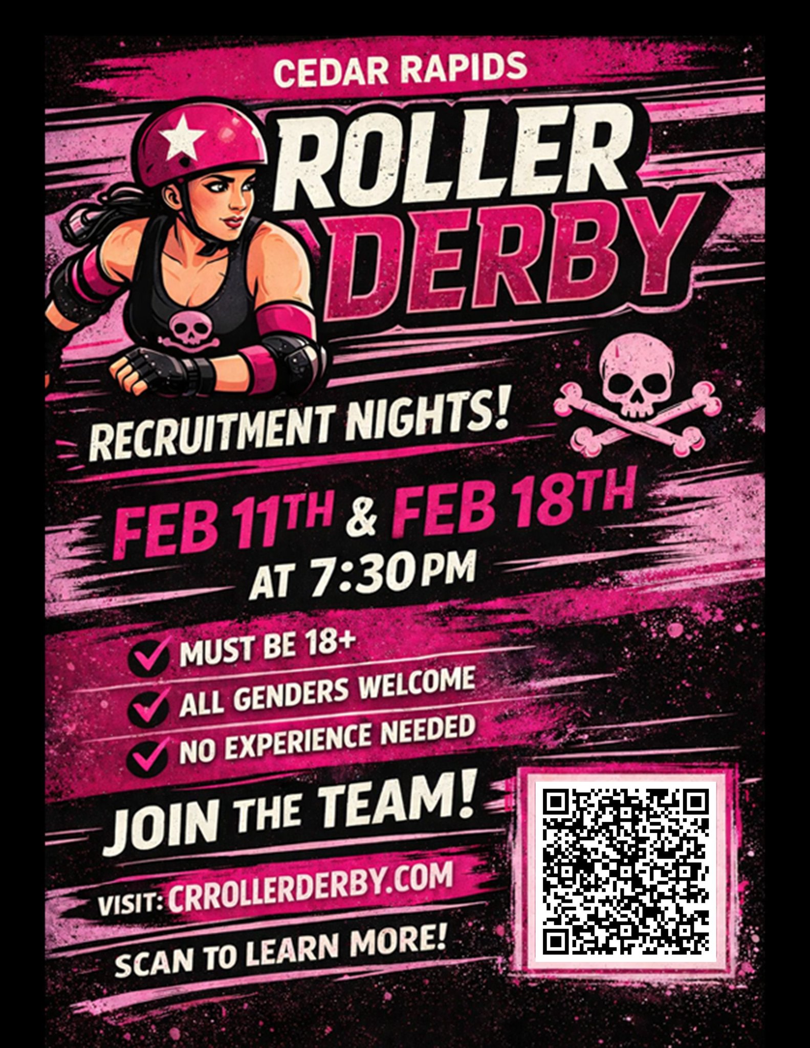 Cedar Rapids Roller Derby is a team of skaters owned and run by its members. The league’s primary goals are promoting community involvement, fundraising, and the sport of flat track roller derby. We will show our community the strength of all of our members through our dedication to the league and commitment to the sport of roller derby.